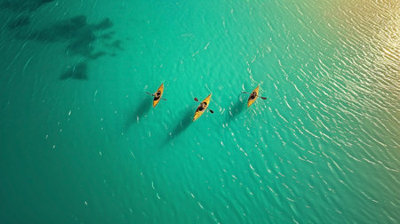 Rowers in sleek canoes glide through shimmering water, creating mesmerizing pattern. sunlight reflects off surface, enhancing serene atmosphere of teamwork and dedication