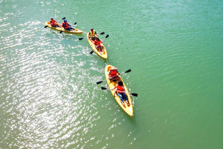 Kayaking top view. Group of kayaks rowing. Kayaks float on the river, view from above. Aerial view from drone.