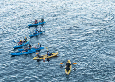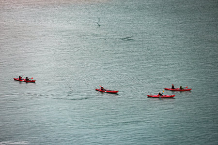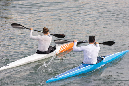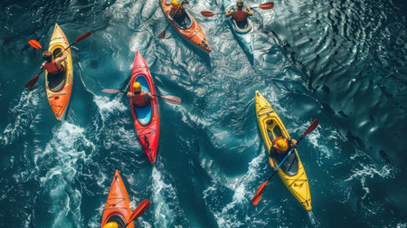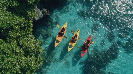 Dynamic image of people kayaking on clear, sunny day, gliding over sparkling blue waters. Thrill and freedom of perfect summer vacation adventure on the sea.