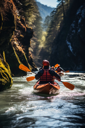 People enjoying kayaking on narrow river in rocky mountains area on sunny summer day during vacation holiday trip.AI Generative.