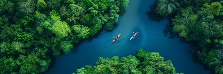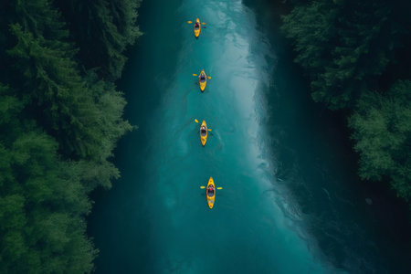 An aerial view captures kayakers traversing a vibrant blue river, surrounded by lush green trees. This image embodies outdoor adventure, teamwork, and the beauty of nature.