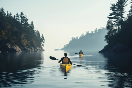 Two kayakers are paddling through calm waters surrounded by trees and mist, enjoying a peaceful morning on the lake