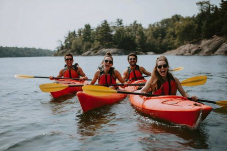 Joyful friends kayaking on a picturesque river or sea during their memorable vacation.