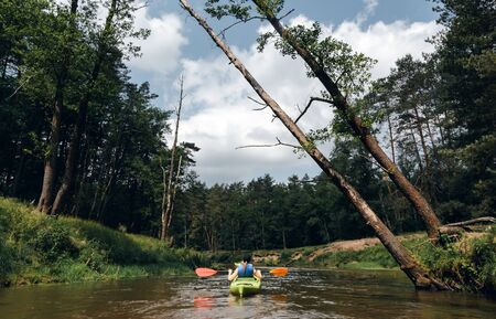 Rear view of a man kayaking on a small narrow forest river surrounded by pine forest in summer
