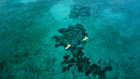 Group of people on stand up paddle board at blue sea. People on Sup board in Mediterranean sea. Aerial view