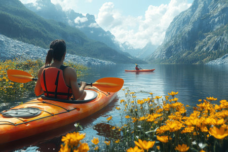 Two kayakers navigate a serene lake framed by majestic mountains and vibrant wildflowers under a sunny sky.