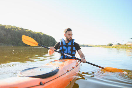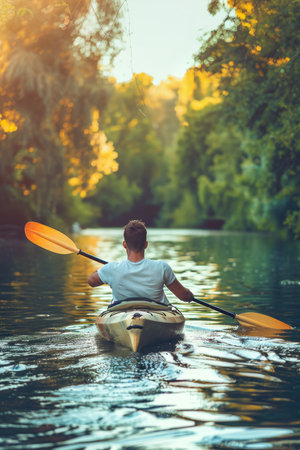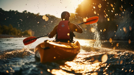 Kayaking is his lifestyle Young man kayaking on river with sunset in the background : Generative AI