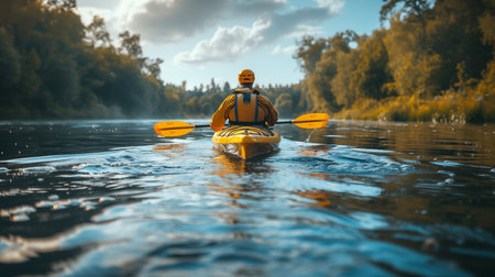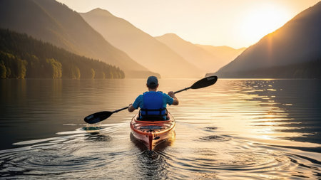 A man gracefully kayaks on the calm surface of the water. Generative AI