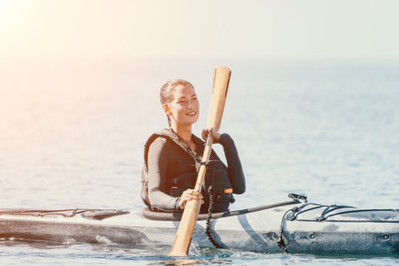 Woman sea kayak. Happy smiling woman in kayak on ocean, paddling with wooden oar. Calm sea water and horizon in background. Active lifestyle at sea. Summer vacation.