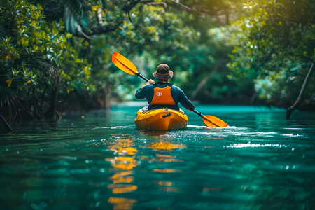 A person in a bright orange kayak navigates through dark, reflective waters. The serene environment highlights the beauty of outdoor adventure and water sports. Generative AI