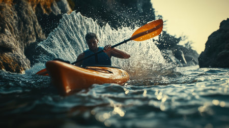 A kayaker maneuvers their boat through turbulent water, splashing and churning as they paddle with determination. The kayaker is wearing a bright orange jacket and a life vest.