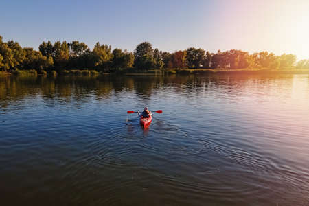 Man kayaking on lake in mountains at sunset. Sport and active life concept