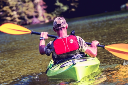 Caucasian Man in the Kayak on the Scenic River