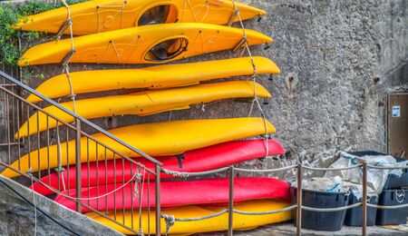 Canoe hanging at the old wall in Riomaggiore, Cinque Terre, Liguria, Italy