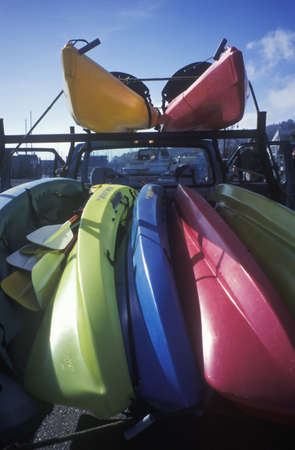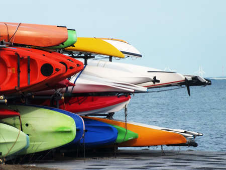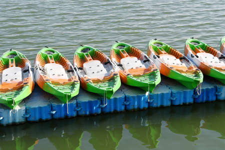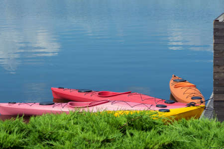 Bright colored kayak from plastic boats in the yacht club. Active summer vacation on the water on a bright sunny day.
