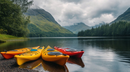 A peaceful scene featuring vibrant kayaks resting on a misty lake, surrounded by lush mountains and greenery, creating a serene atmosphere for nature lovers.