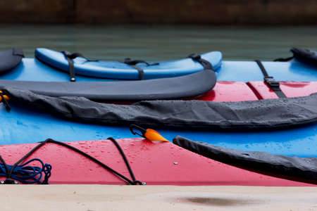 Close up of red and blue kayaks with raindrops and water spray reflect active outdoor adventure fun
