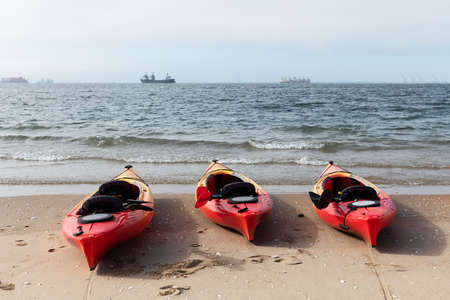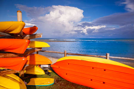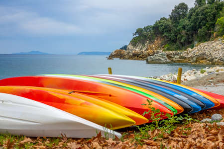 Colored kayak canoes on the sea beach. Summer holidays and activities on the water. Vacation, relax, sport concept.