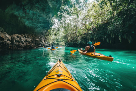 Kayakers navigate through vibrant turquoise waters in a serene cave environment. Lush vegetation frames the water\'s edge, creating a peaceful atmosphere.
