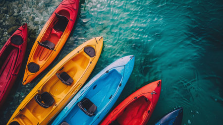 A stunning aerial view of colorful kayaks arranged in a flower pattern on sparkling blue water, encapsulating the essence of summer adventure and leisure activities.