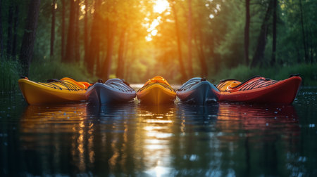 Colorful kayaks float together on serene water as golden sunlight filters through the trees, creating a peaceful atmosphere at dusk.