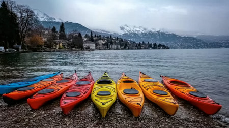 A vibrant collection of kayaks in various colors rests on a rocky shore beside a tranquil lake, with majestic mountains looming in the background, creating a perfect outdoor escape.