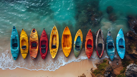 Row of colorful kayaks on a sandy beach against clear blue waters. Beachside leisure equipment. Concept of water sports, beach activity, and vibrant summer fun.
