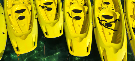 Close-up shot of several bright yellow kayaks floating on the turquoise sea water.
