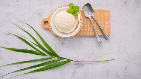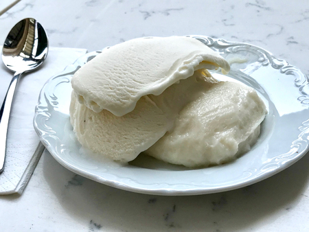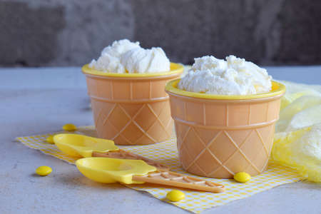 Homemade vanilla ice cream on marble background. White frozen delicious dessert in individual glass.