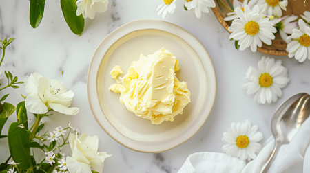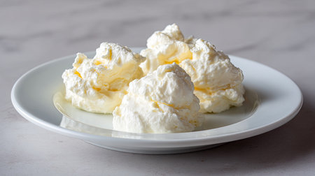 This image features freshly whipped cream presented on a white plate, showcasing its soft texture and glossy finish, perfect for enhancing desserts.