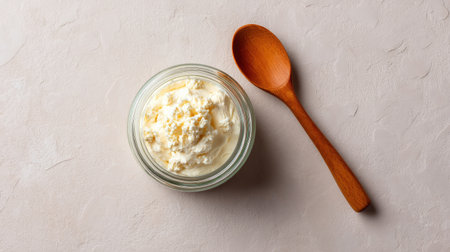 This image features fresh dairy cream in a glass jar accompanied by a wooden spoon, set on a light textured surface. Ideal for various culinary and food projects.