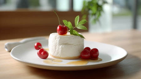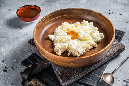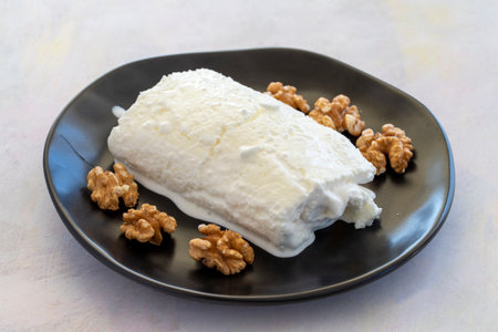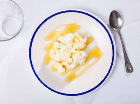 Catalan whey cheese, mato, served on plate with honey