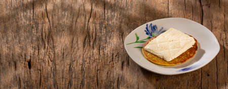 A block of cream cheese on a white plate over weathered wooden background
