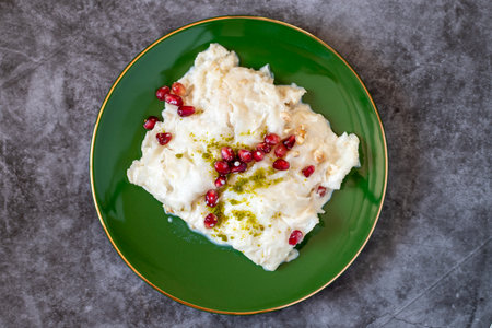 Gullac dessert on dark background. Traditional Ramadan dessert. Güllaç dessert decorated with pistachio and pomegranate. Turkish cuisine delicacies. Top view
