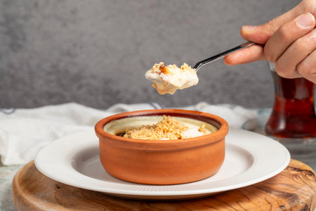Turkish Tavuk Gogsu / Milk Baked Pudding Dessert with Ice Cream. Traditional Food.