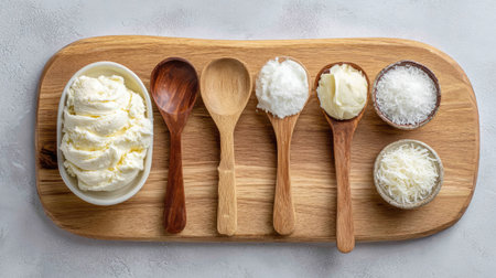 A beautiful wooden board displays a variety of creamy dairy products, including butter and cream, complemented by wooden spoons and shredded coconut, perfect for culinary delights.