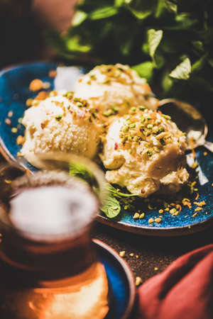 Turkish traditional dessert semolina helva. Scoops of sweet semolina helva with pistachio nuts, fresh mint and Turkish tea in plate over rusty table background, selective focus. Turkish cuisine