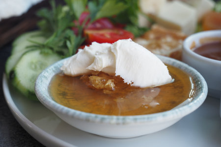 traditional balkan breakfast set kaymak or butter cream flatbread and on a white ceramic