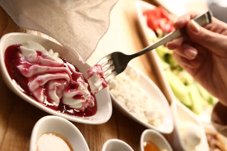 Turkish dessert kunefe served with ice cream on wooden background