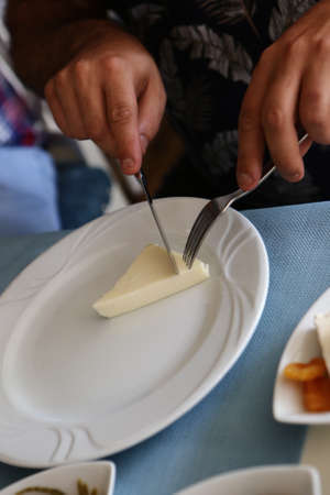 Balkan cuisine. Montenegro. Pljevaljski cheese - local soft white cheese. Copy space
