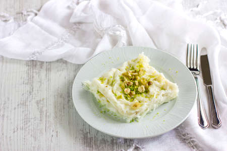 Traditional turkish meal - Gullac. Milk dessert sprinkled with ground nuts and pistachios. Ramadan dish
