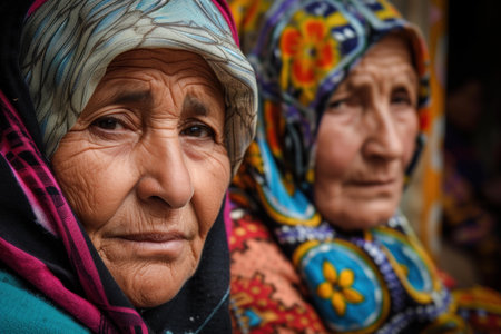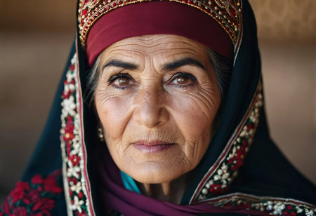 A mature Tajik woman 75 years old, gazes directly showcasing intricate traditional attire, rich cultural heritage of her nationality, evoking wisdom and grace. Brunette woman, wearing a headscarf. AI