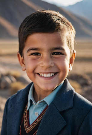 A smiling Tajik boy 5 years old beams with happiness, enjoying the beauty of a sunny day outdoors. His cheerful expression reflects moment of pure joy and innocence. Happy smiling child. AI generated.