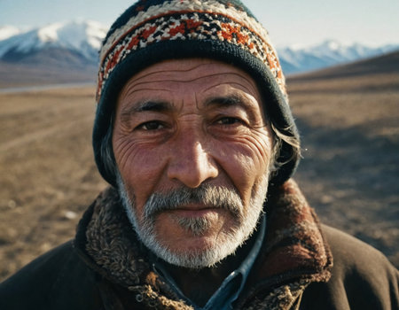 Elderly Kyrgyz man wearing traditional cap and patterned sweater, representing rich cultural heritage