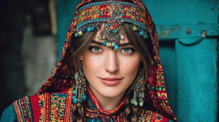 Portrait of a young woman dressed in vibrant traditional ethnic attire, adorned with intricate jewelry, radiating beauty and cultural heritage.