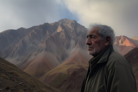 An elderly man in traditional clothing stands proudly by a calm lake, with stunning mountains behind him, radiating tranquility with a gentle smile.