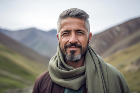 Portrait of a handsome mature man with a beard and gray hair wearing a shawl in the mountains