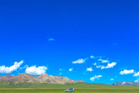 Song Kul Lake View Point with Jeep Snow Capped Moldo Too Mountains Landscape