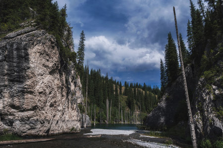 landscape with a beautiful lake with blue water and tree trunks of a sunken forest in summer. Kaindy Lake in Tien Shan mountains in Kazakhstan near Almaty