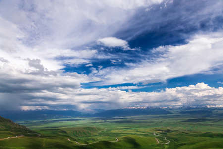 Mountain landscape. High mountain green valley. Suusamyr Valley. Kyrgyzstan. View from the pass
